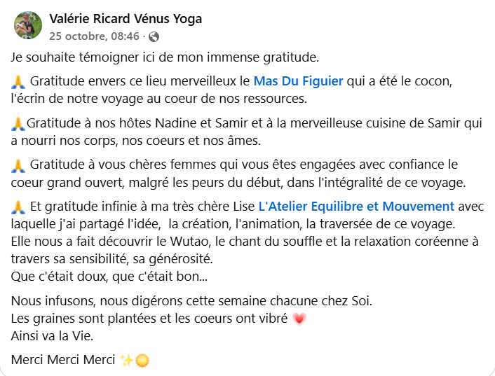 Lors de notre retraite, nous avons découvert la douceur et la bienveillance de Lise à travers différentes pratiques. Le Wutao, cet art corporel poétique nous a invitées à nous reconnecter à notre souffle. En revenant à la conscience du mouvement dans sa lenteur, nous avons appris à goûter au plaisir de ralentir. La pratique du chant du souffle guidée par sa voix enveloppante nous a permis de nous mouvoir en harmonie avec nous-même, la nature et les autres. C'est par sa voix, sa sérénité, son écoute et son empathie que nous avons pu nous ressourcer. Un immense merci!